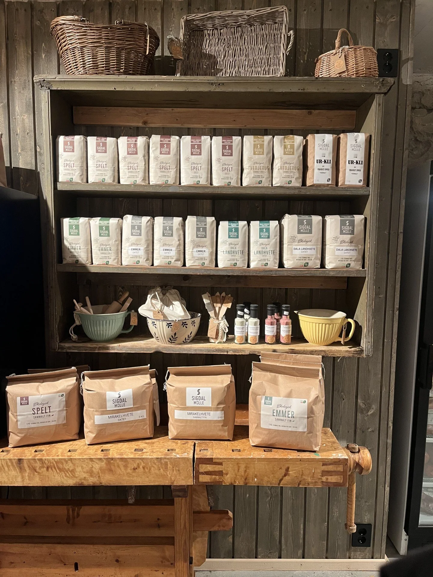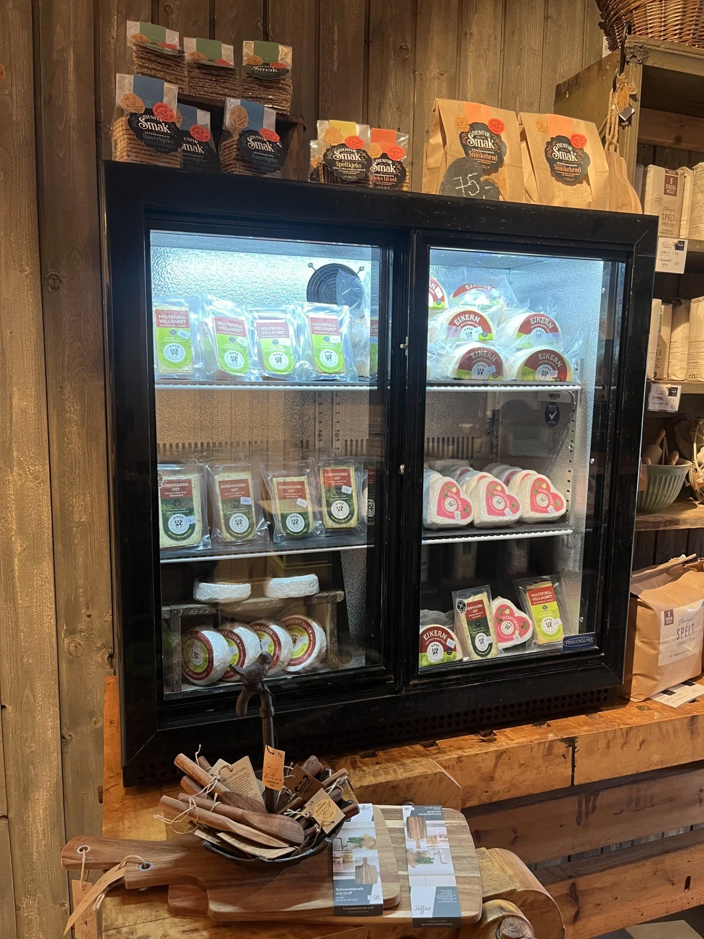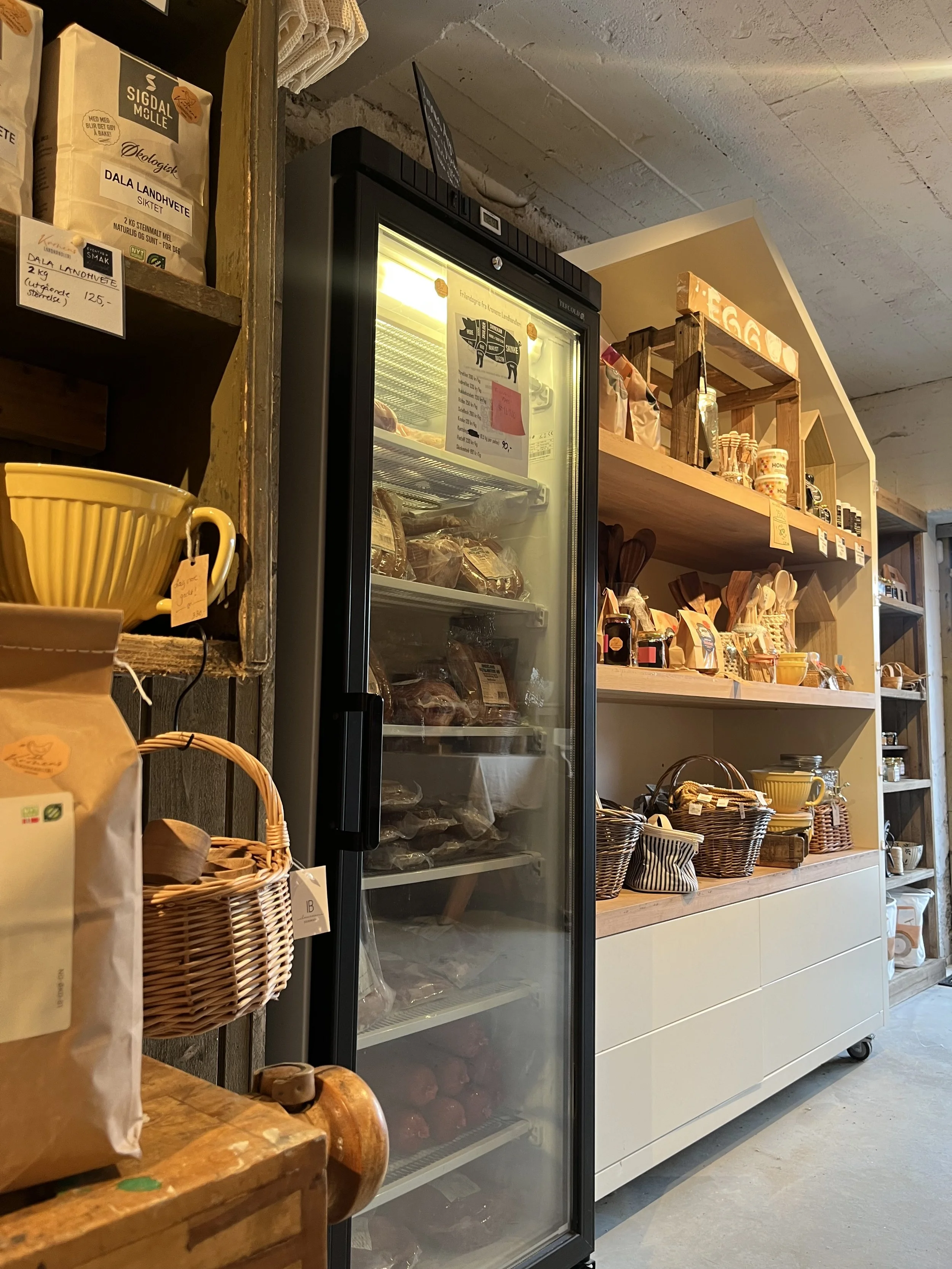 Ost fra Eiker Gårdsysteri, eplemost fra Modumfrukt og mel fra Sigdal Mølle er å finne i hyllene.